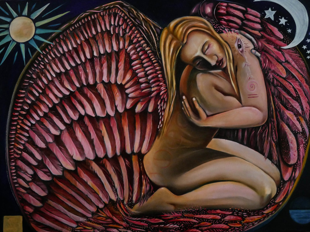 Creating meaning from self-introspection and connection to spiritual elements, my work is an exploration of what it means to be human, through colour, symbols and philosophic reflection.