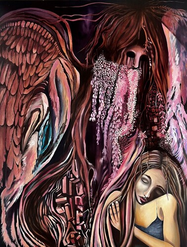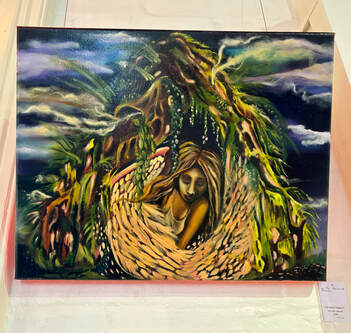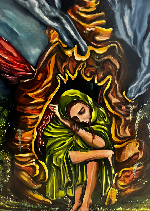 My artwork has always been intuitively connected to symbols, history, mythology and imaginings. This work specifically relates to a place for dreaming and the need to be surrounded or enclosed in a sanctuary. First conceived by obsessively drawing the winged figure reposed in a grotto (progression from former body of work, Angel Architecture), the oil paintings and hand-built ceramics combine to create an otherworldly atmosphere, a liminal space for dreaming. The Grotto Makers is an exploration of self, sanctuary and a place to be safe for creating and wondering, a difficult task in this increasingly frenetic world.